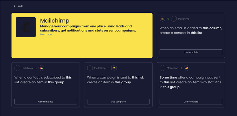 The native integration is one-directional only. You can push contacts from Monday.com into Mailchimp, but updates inside Mailchimp never flow back into Monday.